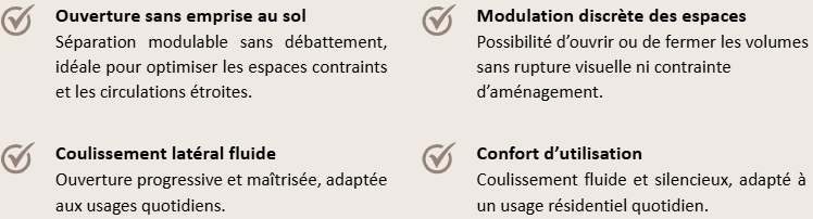 La verrière HOME à porte coulissante permet de moduler les espaces sans empiéter sur les surfaces de vie. Son système de panneaux vitrés sur rail assure une séparation fonctionnelle tout en conservant une transparence maximale et une grande fluidité de circulation.