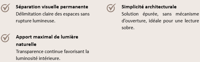 La verrière HOME fixe structure l’espace sans ouverture, en privilégiant la transmission de la lumière et la lisibilité des volumes. Elle constitue une solution architecturale sobre et pérenne pour délimiter sans isoler les espaces.