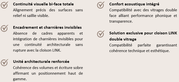 La porte bi-affleurante LEGENDE Pyxel est une solution architecturale haut de gamme conçue pour garantir une continuité visuelle parfaite de part et d’autre de la cloison LINK. Son encadrement dissimulé et ses charnières invisibles assurent une intégration totale, sans rupture entre les surfaces.