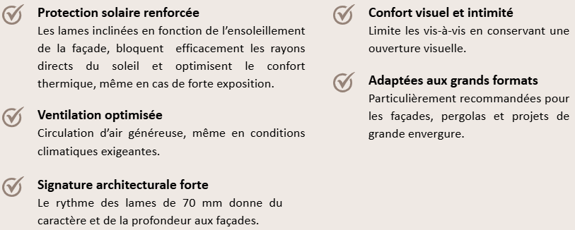 Les persiennes SUNLINE SL70 se distinguent par leurs lames aluminium de 70 mm, idéales pour les grandes surfaces et les façades fortement exposées. Elles offrent une protection solaire renforcée tout en apportant une signature architecturale forte.